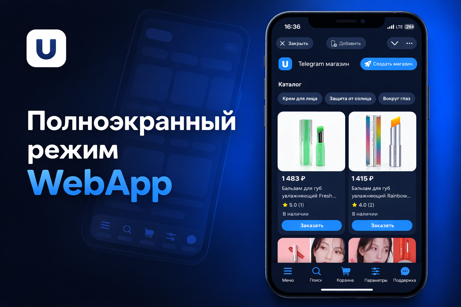 Полноэкранный режим в uShopWebBot реализован исключительно для мобильных устройств. В десктопной версии интерфейс сохраняет стандартный вид, что обеспечивает оптимальное удобство использования на разных платформах. Такая адаптивность не только улучшает визуальное восприятие, но и придаёт проекту премиальный вид.